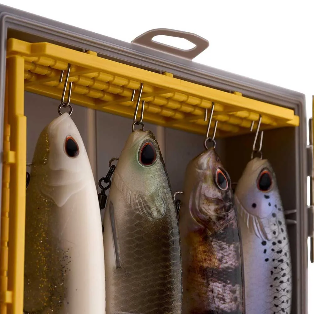 Die EDGE Swimbait Box wurde entwickelt, um Köder getrennt und geschützt aufzubewahren. Sie nutzt die Schwerkraft, um Swimbaits und Glide Baits aufzuhängen und sie im Inneren der Box anzuheben, um eine Verformung des Schwanzes zu verhindern und die Köderaktion zu erhalten.