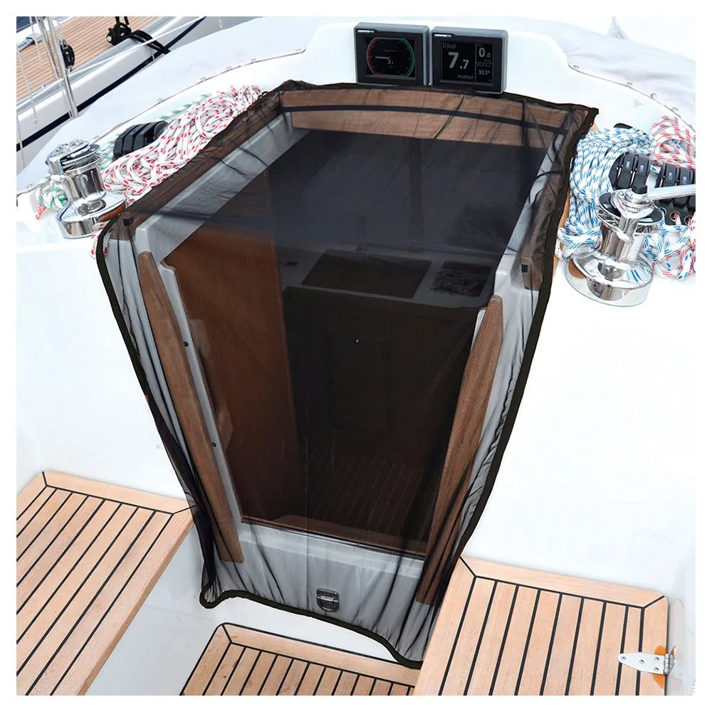 Dank des in der Kante enthaltenen Bleistreifens behält das Moskitonetz seine Position bei und kehrt zu ihm zurück, sobald es angehoben und übergeben wird, um die Kabine zu betreten.