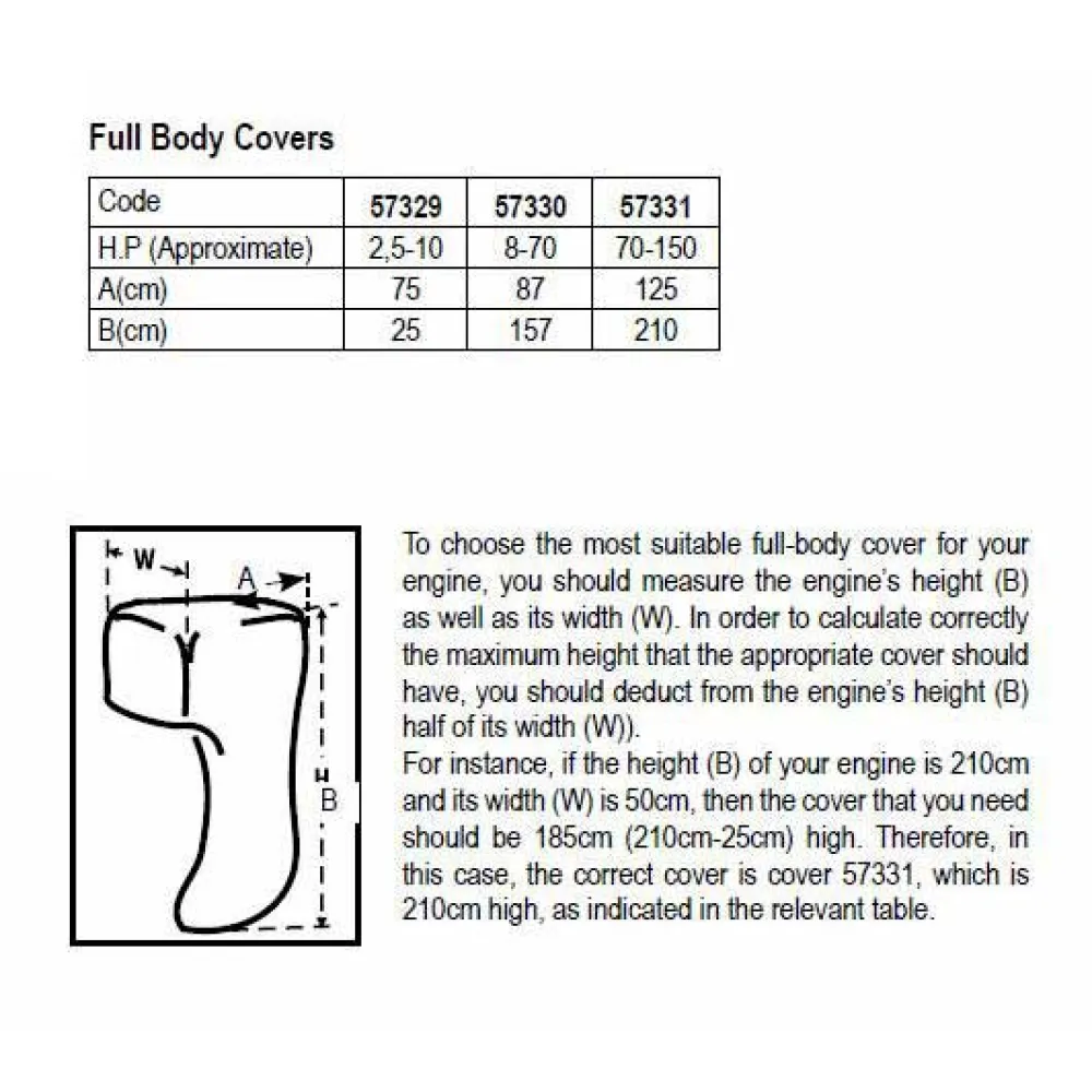 Es gibt 7 verschiedene Größen für die Abdeckungen des oberen Teils des Motors und 3 verschiedene für die ganzkörper Abdeckungen. Alle Abdeckungen ‘SeaCover’ sind in silberner Farbe erhältlich. Die untere Tabelle zeigt die verschieden Größen der Abdeckungen ‘’SeaCover’’ an. Die Maße werden in Länge, Breite und Höhe dargestellt (Bild 1). Die PS-Anzahl ist indikativ und ist nicht der einzige Faktor, den Sie bei der Wahl der Abdeckung Ihres Motors berücksichtigen müssen. Der Motortyp (zweitakt, viertakt), die Länge der Pinne, Marke und Baujahr Ihres Motors sind ebenso notwendig für die richtige Wahl der Abdeckung.