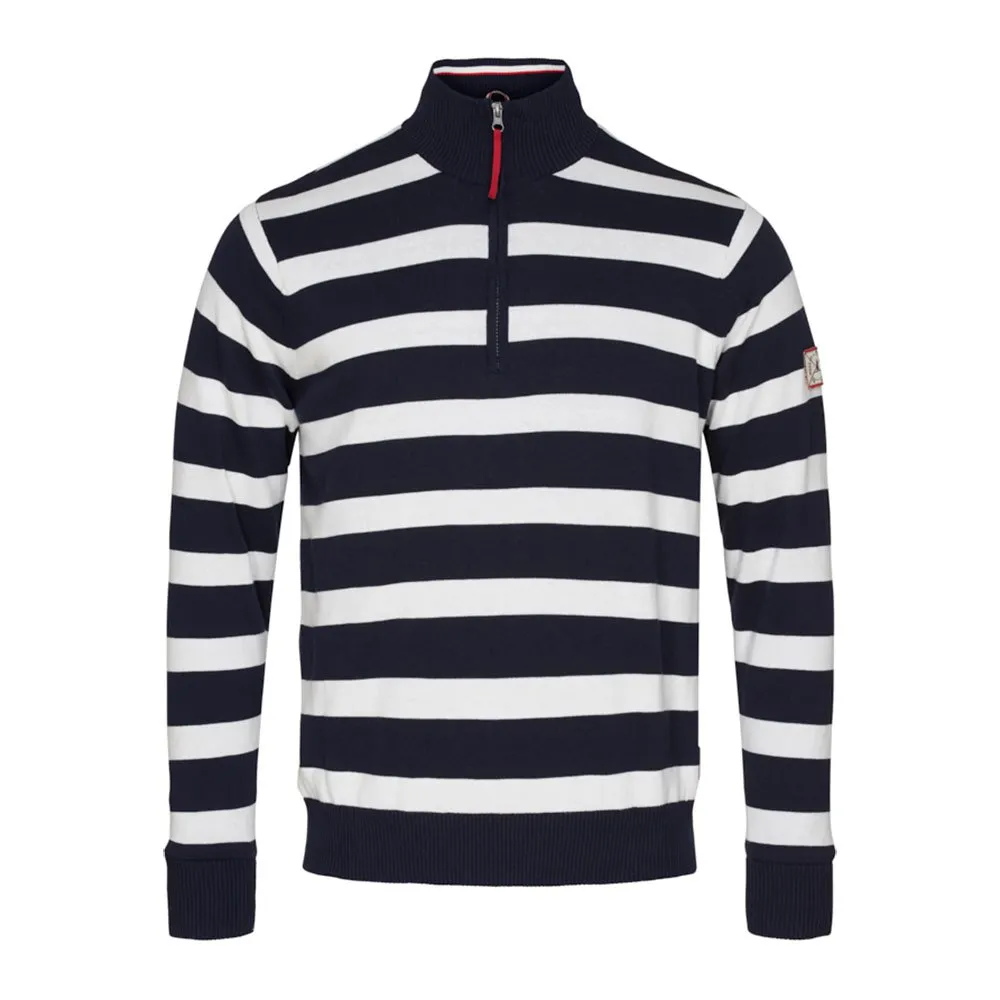 Unser gestreifter Strickpullover mit Halbzipper im nautischen Stil aus 12gg Baumwolle/Polyester für Herren.