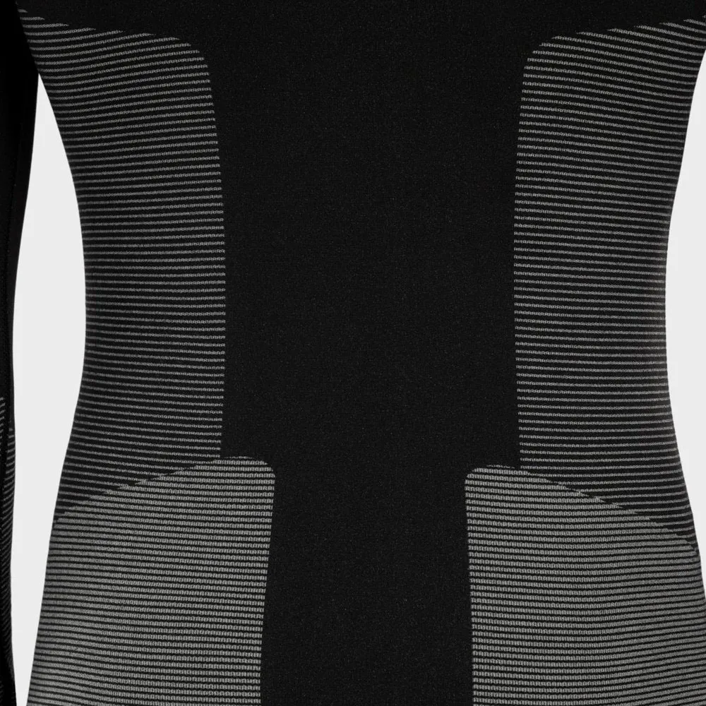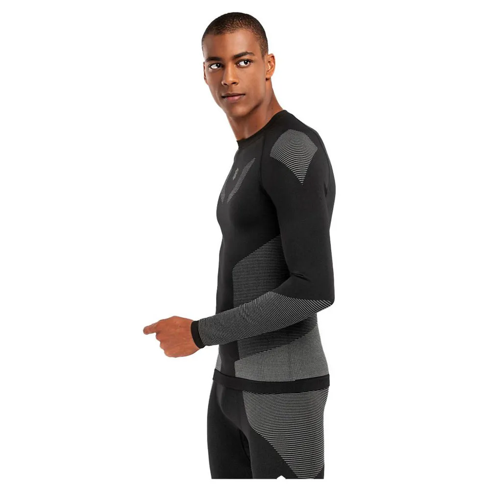 Entworfen mit einer ergonomischen Kompressionspassform, unterstützt dieses Langarm-T-Shirt Ihre wichtigsten Muskelgruppen, hilft, Muskelvibrationen zu reduzieren und das Einsetzen von Ermüdung zu verzögern. Die inhärente Vier-Wege-Stretch-Fähigkeit des Gewebes garantiert vollständige Bewegungsfreiheit und ermöglicht einen vollen und uneingeschränkten Bewegungsspielraum. Seine nahtlose Konstruktion minimiert Reibung und verhindert Scheuern, wodurch es ideal für längeres Tragen unter Mid-Layern und Außenschichten ist. Das klassische Rundhals-Design ohne Reißverschluss bietet eine glatte, bequeme Passform um den Hals und verhindert jegliche Irritationen beim Schichten.