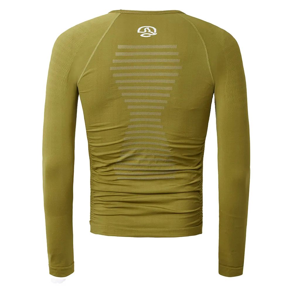 Atmungsaktives, schnelltrocknendes und nahtloses First-Layer-T-Shirt, hergestellt aus recyceltem Polyester aus Flaschen, die aus dem Meer gesammelt wurden, und Elastan, das mit Polyamid aus recycelten Fischernetzen beschichtet ist.