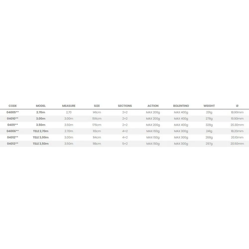 Bolentino-Ruten, die sowohl in teleskopischer als auch in mehrteiliger Version in den Größen 3,00 und 3,50 Meter erhältlich sind und mit zwei Spitzen unterschiedlicher Stärke ausgestattet sind. Sie wurden für das Grundfischen vom Boot aus mit Blick auf Dorade und Wolfsbarsch der Lagunen der nördlichen Adria entwickelt. Diese kraftvollen und handlichen Ruten sind in der Lage, Gewichte von 300 oder sogar 400 Gramm für die mehrteilige Version zu handhaben. Ausgestattet mit robusten SiC-Steinringen, einem Schraubrollenhalter aus Metall, um selbst großzügig dimensionierte Rollen zu halten, einem Shrink Rubber-Griff für hervorragenden Halt und einer hinteren Gummikappe für einen komfortablen Kampf.