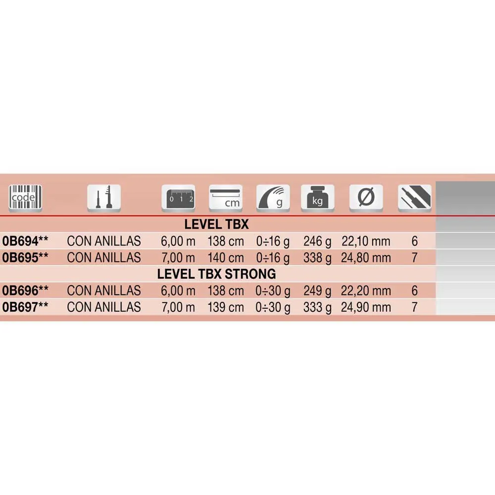 TBX Strong ist aus 40-Tonnen-Carbon gefertigt und verfügt über eine Power-Action von 0-30 g und ist mit Y-Type-Ringen (TBX) und K-Type-Ringen (TBX Strong) ausgestattet.