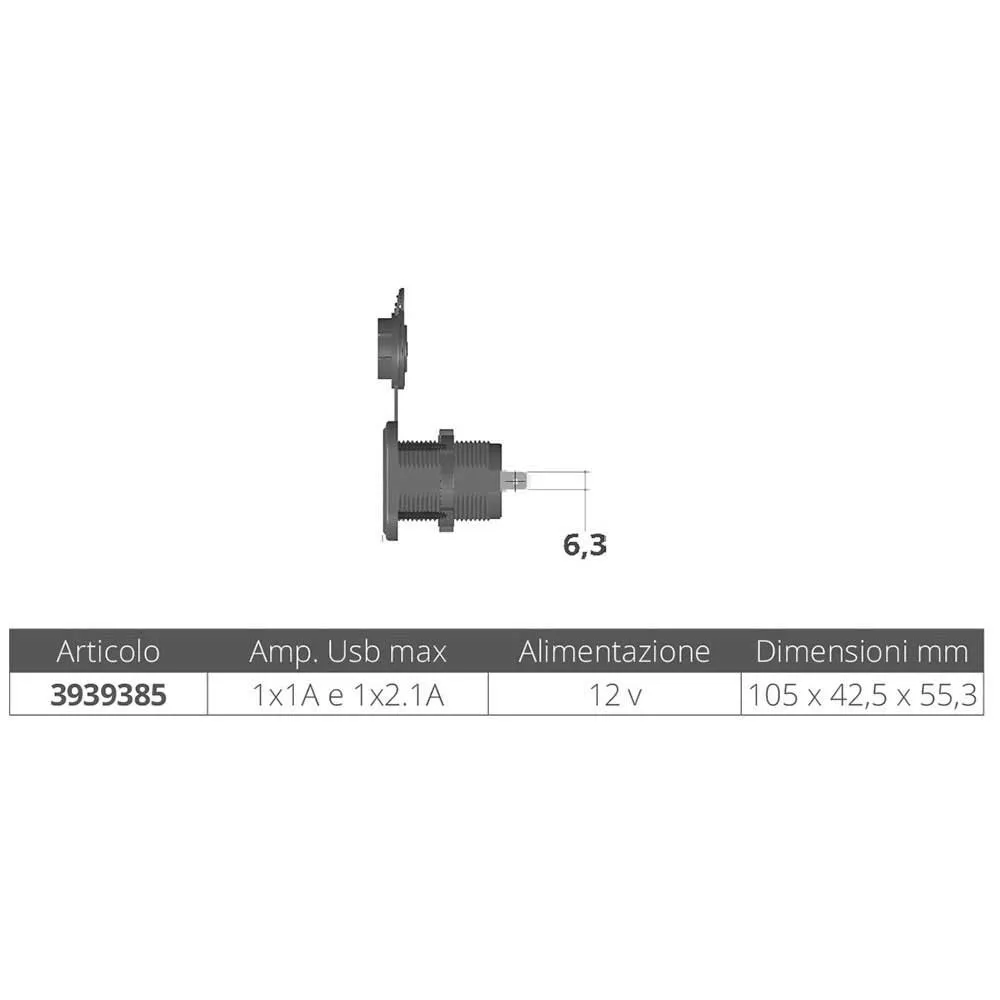 In plastic, double Usb output and voltmeter indicator for battery status. Protective cap for USB sockets.