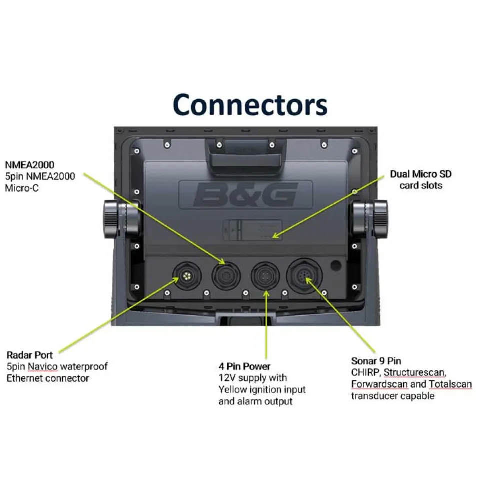 - Connectivity: Ethernet (B&G Broadband Radar only), NMEA 2000, Power, Sonar Transducer