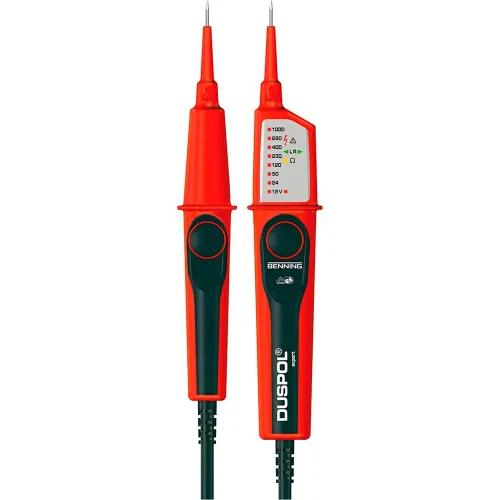 The DUSPOL voltage tester has a direct display system with a low load on the test point. If necessary, a load circuit can be switched on via push-button, which suppresses inductive and capacitive ´´blind voltages´´. This allows a clear distinction to be made between high-energy and low-energy circuits. A switchable vibration motor, whose vibration intensity increases proportionally to the applied voltage, is an additional indication of the presence of a voltage.
