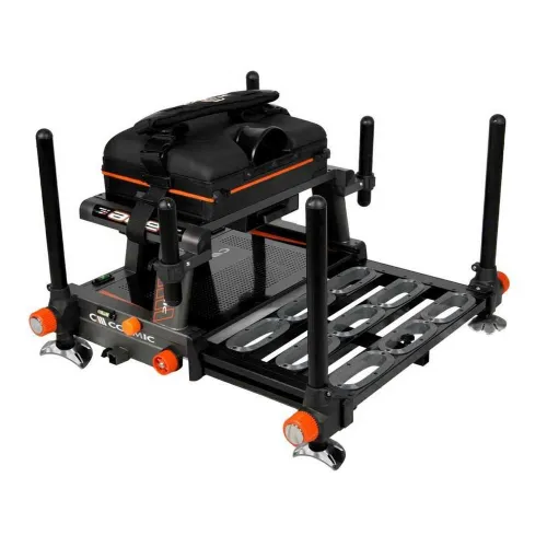 ACE is designed for those who require a solid and versatile platform. The reinforced frame and structural design ensure stability even with heavy loads, while the extra-large platform offers ideal freedom of movement for side fishing. The design is completed by drawers integrated into the frame, high-grip knurled knobs, perforated sheet metal bottom, perforated aluminium feet, 3-level system and ergonomic seat for maximum comfort.