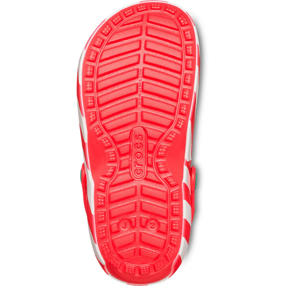 This festive style features a cheerful Christmas print on the upper topped with 6 exclusive Jibbitz™ charms.