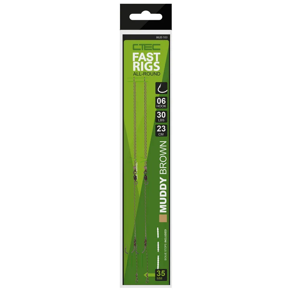 Fast Rigs all-round are made with simplicity in mind. This basic hair rig is probably the most widely used pattern in carp fishing. The super sharp barbed hook is tied to a supple braid. Each rig is finished off with a size 8 swivel which fits perfecty in the CTEC size 8 safety clips.  As with the complete CTEC terminal tackle range, these Fast Rigs are available in muddy brown or weedy green variation.