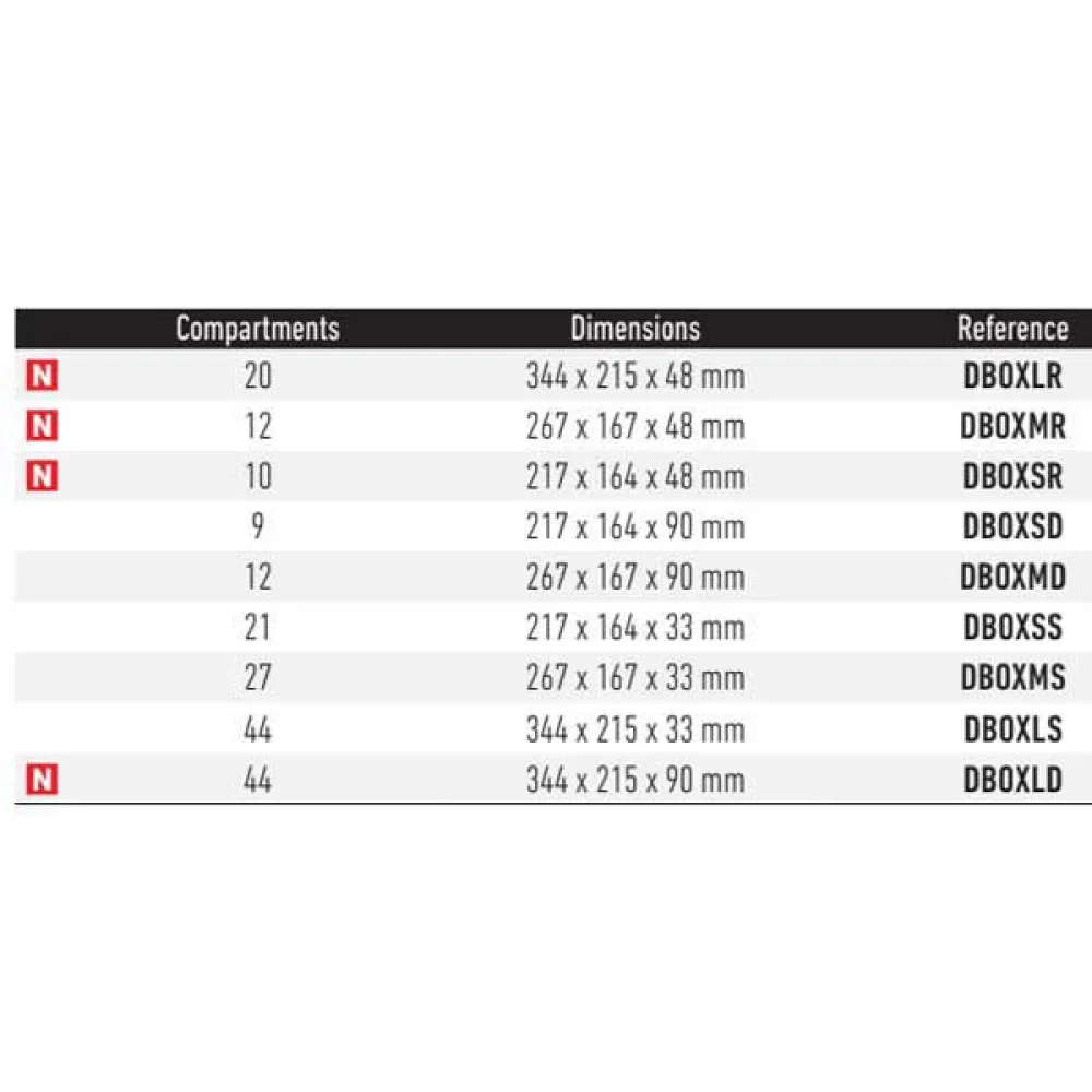 A new range of modern lure boxes. The DBOX boxes come in a variety of depths and sizes and are made from recycled fluorocarbon and halogen-free polypropylene. Feature clips on 4 sides for secure fastening and completely waterproof thanks to a seal around the edge of the lid. Each box is carefully designed to maximise the storage space available.