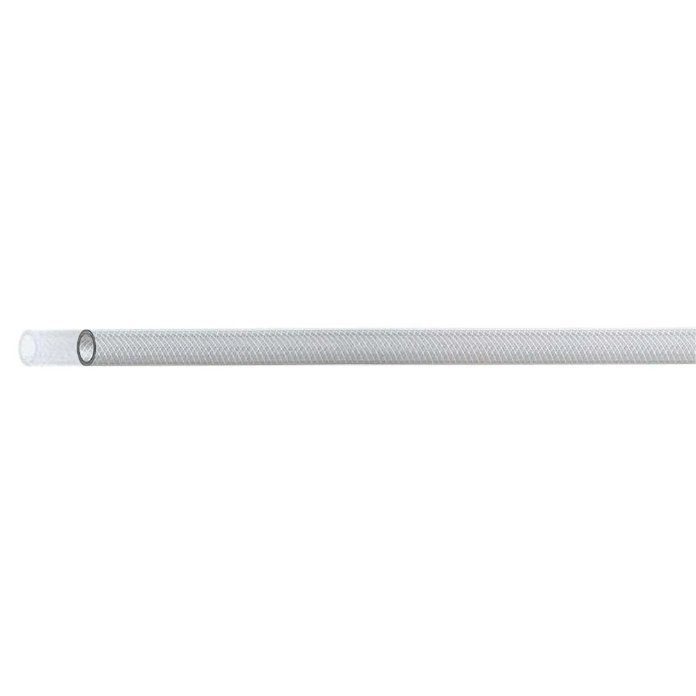 PVC Hose, soft, non toxic polyester braided yarn, transparent. Temperature range -10°C +60°C. Weathering and most chemicals resistant. Application : compressed-air, food liquid according to CE rules. Working pressure: 10 bar.