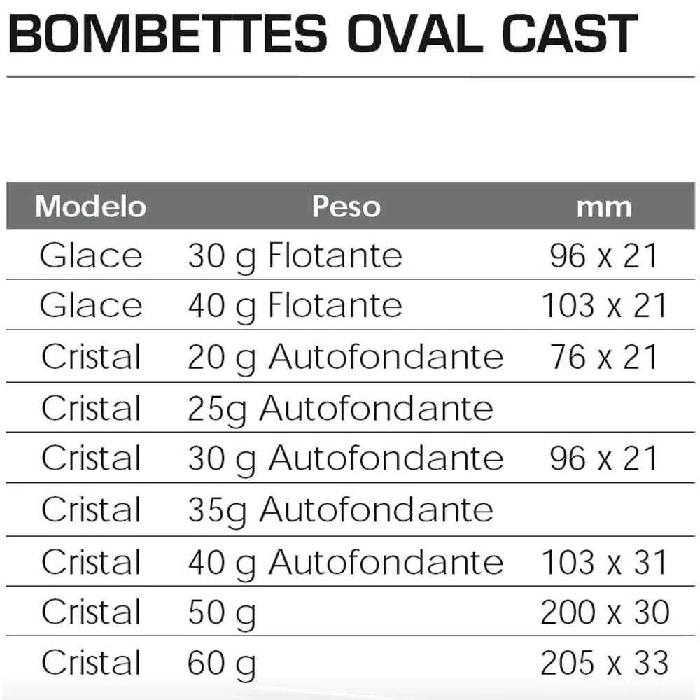 Specifications Kali Oval Cast Sinking Bombette
