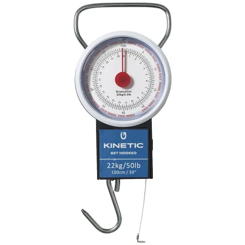 Easily keep track of fish up to 22kg and 100cm with this convenient tape and scale. Scale´s zero can be adjusted for precision measurements. Collapsible handle and hook for easy transportation and storage.