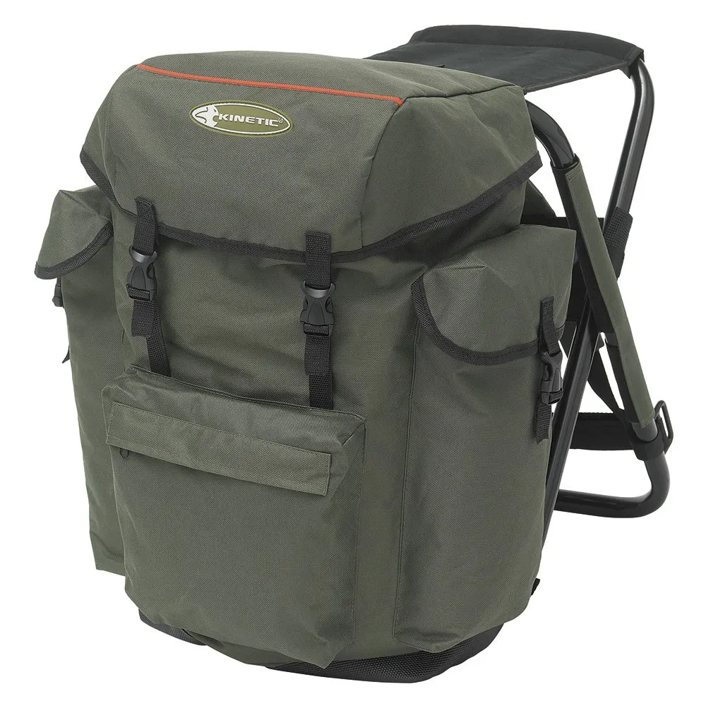 Large 35L Kinetic Chairpack made of durable fabrics for long hikes with more gear. A strong aluminium frame and a high seat (50cm) let you sit comfortable for hours. Three large outer pockets and a gun protection.