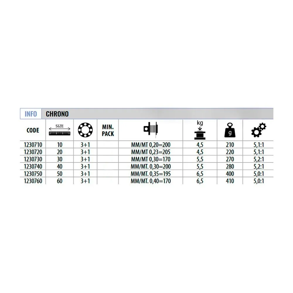 Reel Equipped With 3 + 1 Bearings, Big Line Roller And Balanced Rotor. In Sizes 10-20 / 50-60 It Is Preloaded With A Blue Line While In The 30-40 Versions The Preloaded Line Is Black. Graphite Spool.
