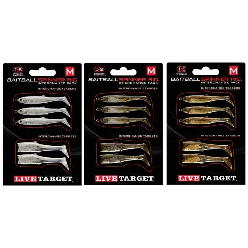 Customize or refresh your LIVETARGET BaitBall Spinner Rig with the LIVETARGET BaitBall Spinner Rig Interchange Pack. The Interchange system makes it convenient to create your own color patterns and replace bodies. Each Interchange Pack contains three Teasers and two Targets. Select the Interchange System that matches your Spinner Rig frame size as noted by the red square size symbol: S, M, L on the package. This assures the replacement fish match the original frame.
