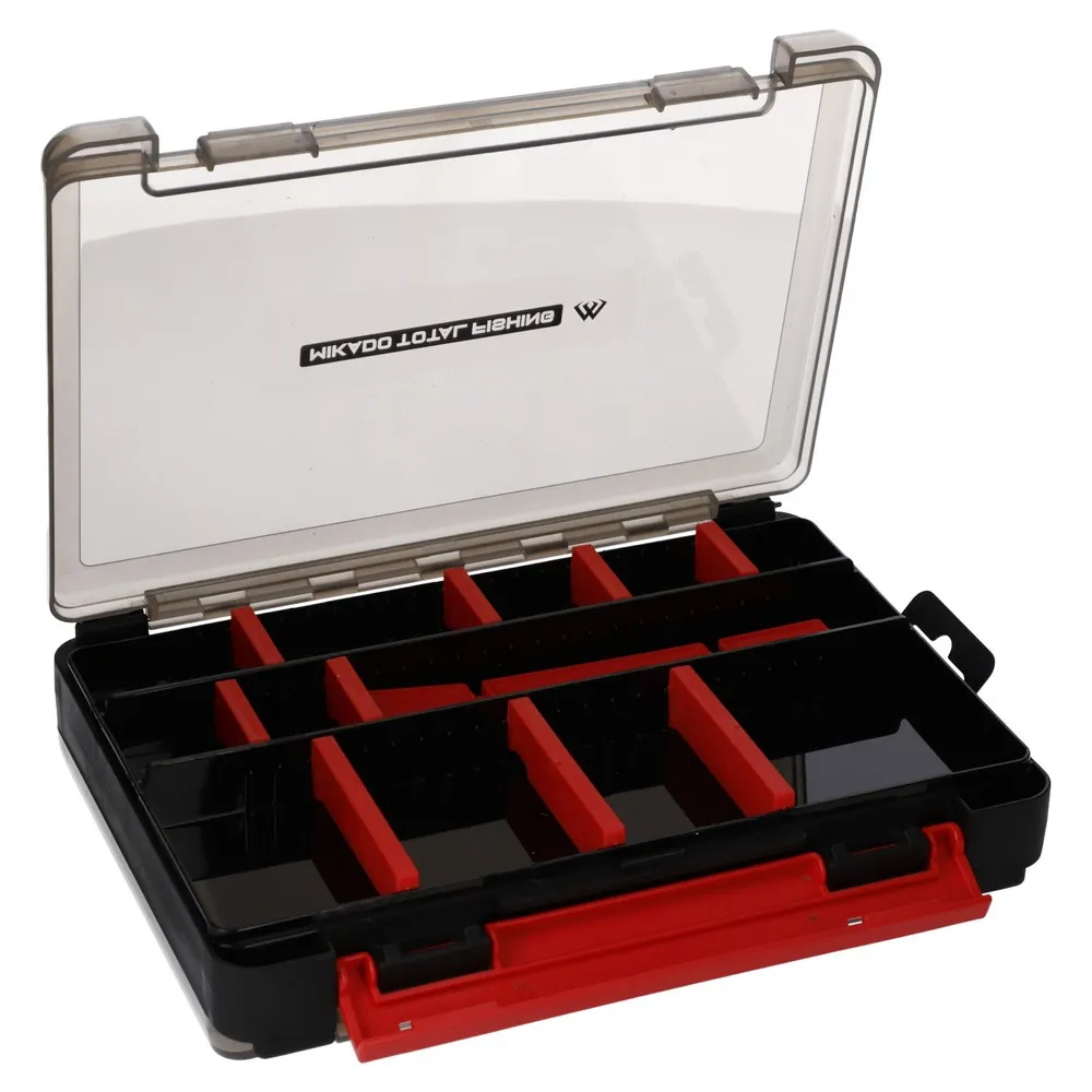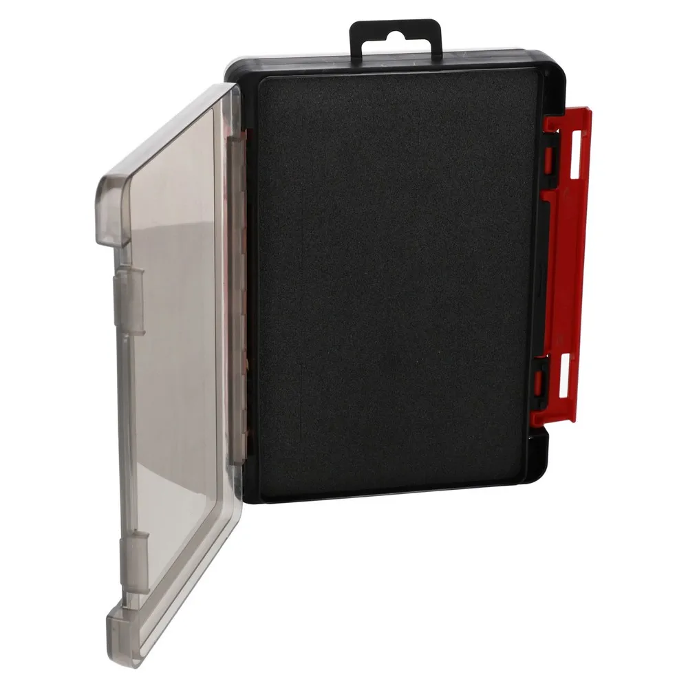Double-sided fishing box made of high-quality plastic with secure closing. Equipped with a sponge on one side and classic plastic compartments on the other. Perfect for spinners, wobblers, spoons and cicadas.