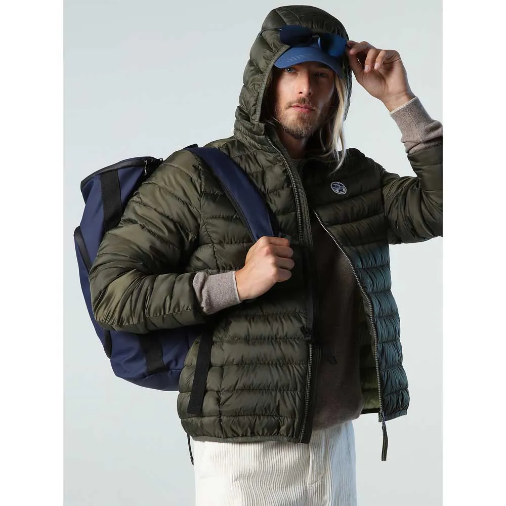 Recycled nylon micro-ripstop nylon puffer jacket with Repreve padding and striped quilting. Finished with a detachable hood, side pockets and a zip fastening.
