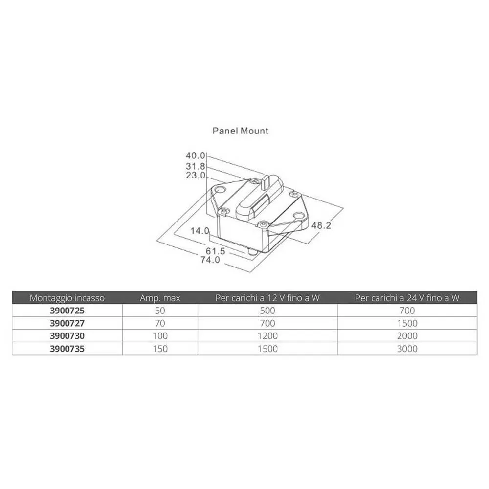 Unipolar thermal switch for high power uses such as windlasses, winches, capstans and thrusters. Tin and sealed for use in engine or bilge rooms. Maximum voltage 42 V. Equipped with reset mechanism that indicates the status of the switch. Complies with SAE J 1625 regulation.