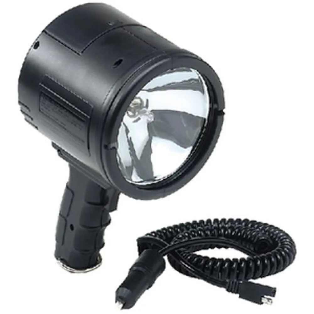 12-volt Spotlight. 55-watt quartz halogen bulb. Removable 10-ft. coil cord with handy storage compartment. Trigger switch.