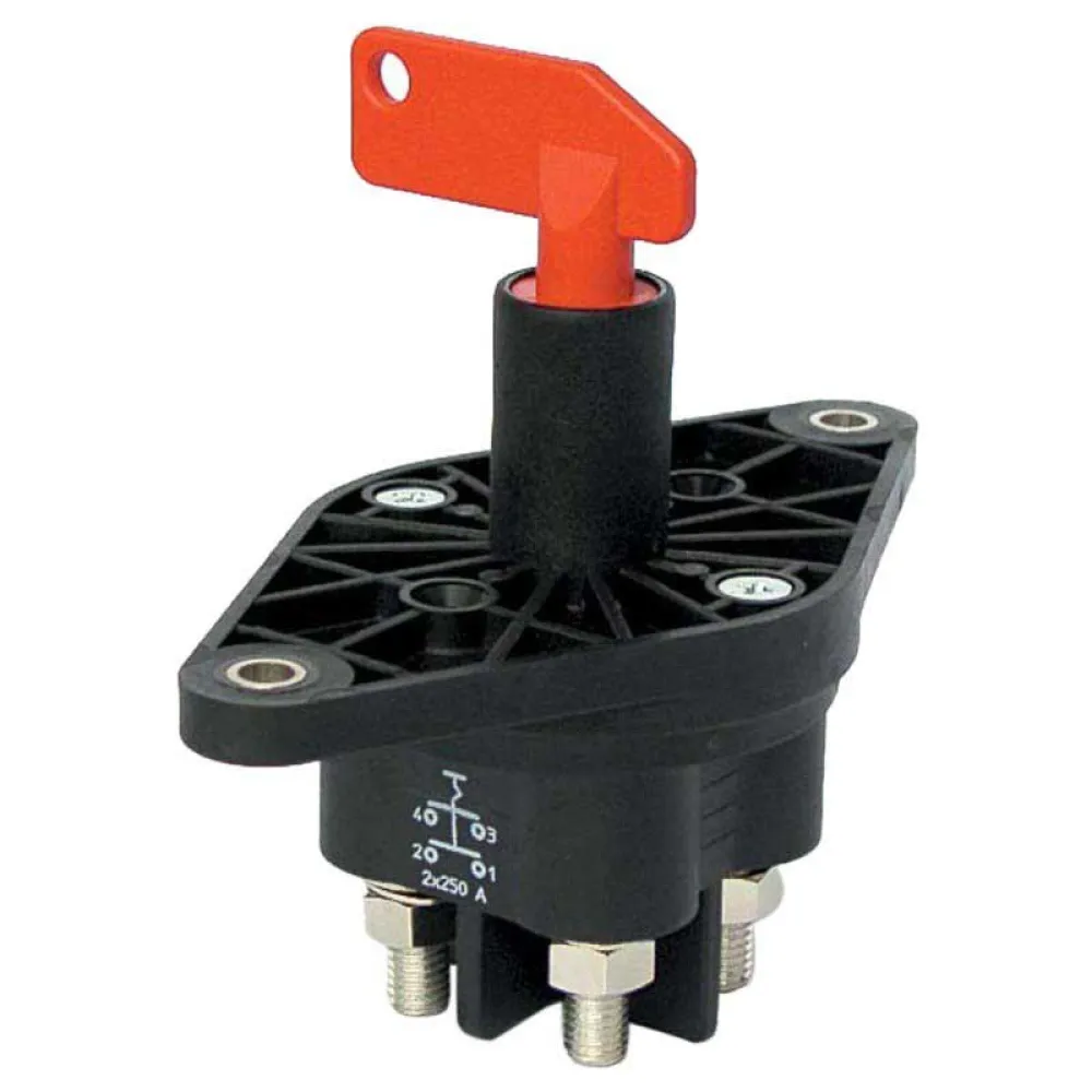 The main battery switch features a sleek design with a black body and red markings, allowing for easy identification and operation. It is constructed from high-quality materials, ensuring durability and resistance to wear and tear. The switch operates using a rotary mechanism, requiring a simple twist to turn the power on or off.