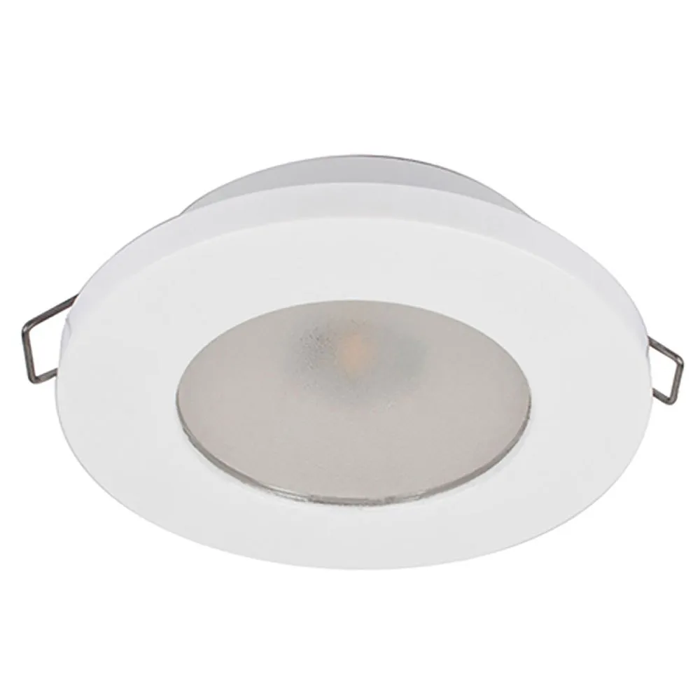 Waterproof downlight IP40 with 2 LEDs ( 100 Lumen ) high brightness, warm white light, with circular frame, made with plastic RAL 9010, withsatinized polycarbonate diffuser, ideal for ceiling and wall installation.