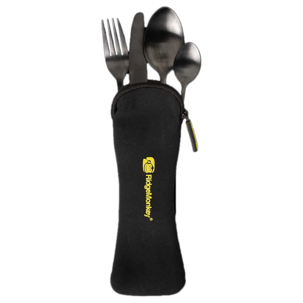 The RIDGEMONKEY DLX Four Pack cutlery set in Silver / Black is the ultimate dining solution for anglers and outdoor enthusiasts. This premium set includes four sets of high-quality stainless steel cutlery, each complete with a knife, fork, spoon, and teaspoon. The sleek silver and black design adds a touch of style to any bivouac or camping trip.