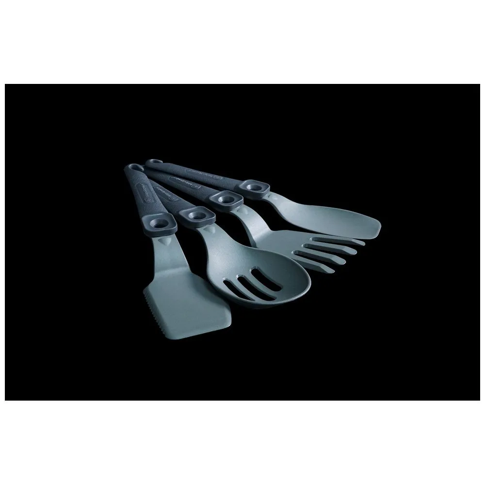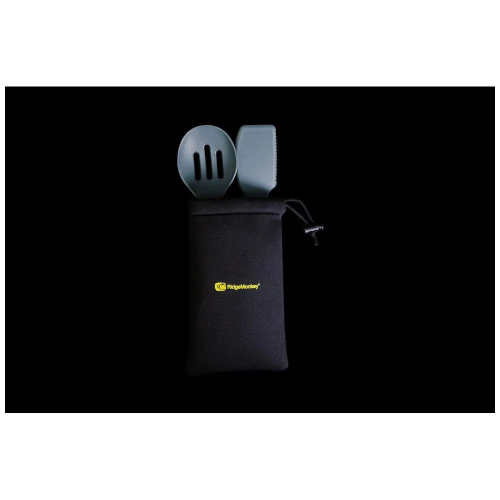 The RidgeMonkey Q-Lock Utensil Set is rigid, hard-wearing and consists of a forked spatula, serrated edged spatula, spoon and a slotted spoon. Featuring our unique Q-Lock folding handle system and a useful hanging hook for storing or drying. The utensils also come supplied in a neoprene pouch for easy storage.