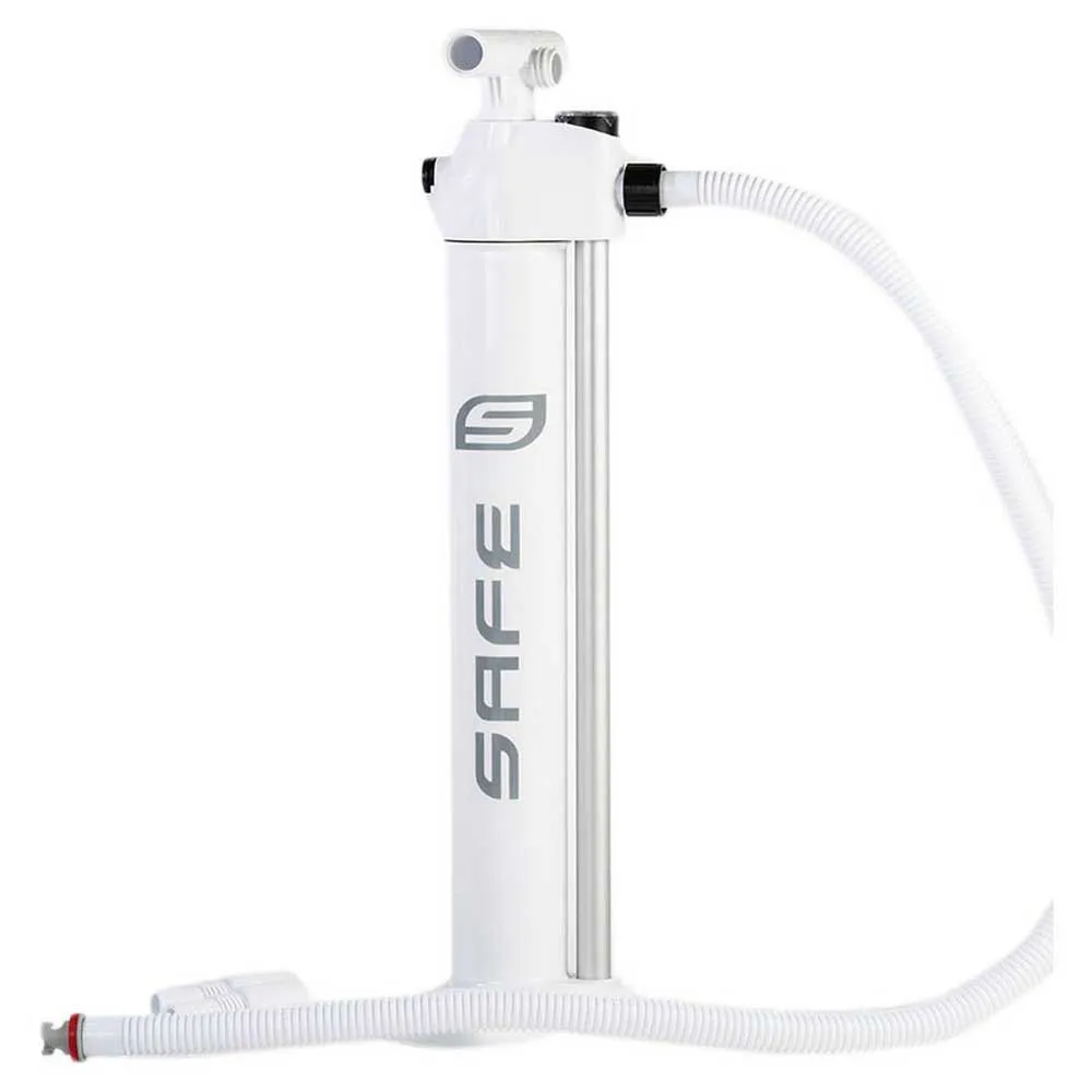 A patented double-flow SAFE pump with air gauge for the inflation of the inflatable sup boards , with the possibility of inflating up to pressure 26psi. The pump has a slightly elongated shape , is very robust and has the aluminum shaft ; these characteristics make it suitable to inflate a table in 4/5 minutes of time allowing a minimum of effort. CAPACITY_ 1.8+1.8L, max. pressure 26psi as DIN EN 16051 CHARACTERISTICS_ seals and anti-sand filter for long life of pump and sup board, high-airflow piston for an easier inflation, switch tap for double/single action.