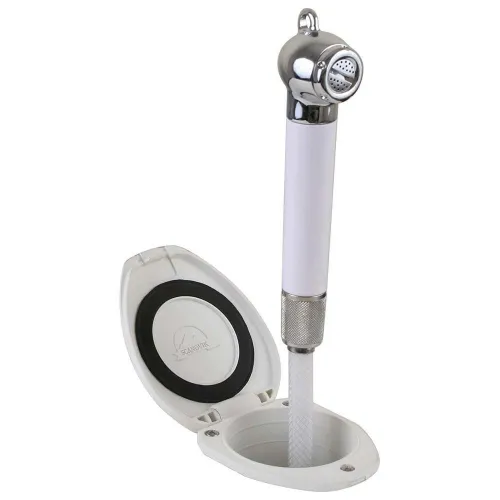 Experience convenience at your fingertips with a design focused on user-friendliness and efficiency. The unit includes a generous, flexible hose that provides ample reach for various tasks, from showering on the swim platform to rinsing the cockpit. The ergonomic sprayer handle is designed for comfortable, one-handed operation, delivering a consistent and refreshing water flow. The standout feature is the innovative hinged cup and cap combination. This clever mechanism not only provides a watertight seal and protection for the shower head but also ensures a completely flush and seamless appearance when closed, preserving the clean lines of your boat.