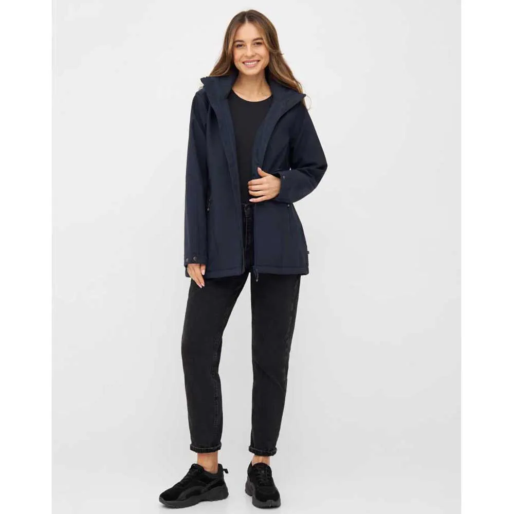 Softshell jacket with adjustable straps in waist, 2-way front zipper and detachable hood.