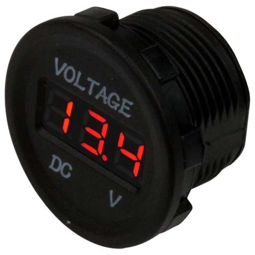 Round Digital Volt Meter is the same compact round size as a standard 12V receptacle supporting many installation options. Constructed of injection molded nylon. Designed for use in interior or fully protected locations only. LED display. Input 8-32VDC. RoHS compliant.