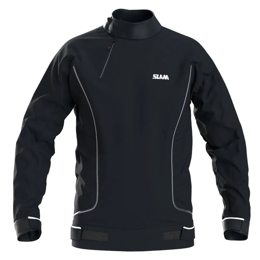 The Pro Racing Smock Top can be worn when sailing the waves, tackling the high seas and in the most dynamic inshore races. It is made of three-layer fabric with a DERMIZAX™ (Toray) membrane, for extremely high performance with waterproof protection at 30,000mm and breathability 8,000gr/sqm/24h. The fit is designed to be comfortable: at shoulder and arm level, the smock top favours ample freedom of movement, while the hip area remains a regular fit. This option has been designed for those sailors who take on the most dynamic roles on board, for those who drift or foil. When that bucket of water hits you at every tack, the spray top will be your ideal defence, allowing you to stay dry and focused on sailing. The smock features a polyurethane (PU) collar and cuffs that can be adjusted with Velcro; the neck opening with inner gusset has a waterproof zip. The seams are taped. The bottom is neoprene with a Velcro adjustment to keep the back warm and protected. Reflective Slam logo.