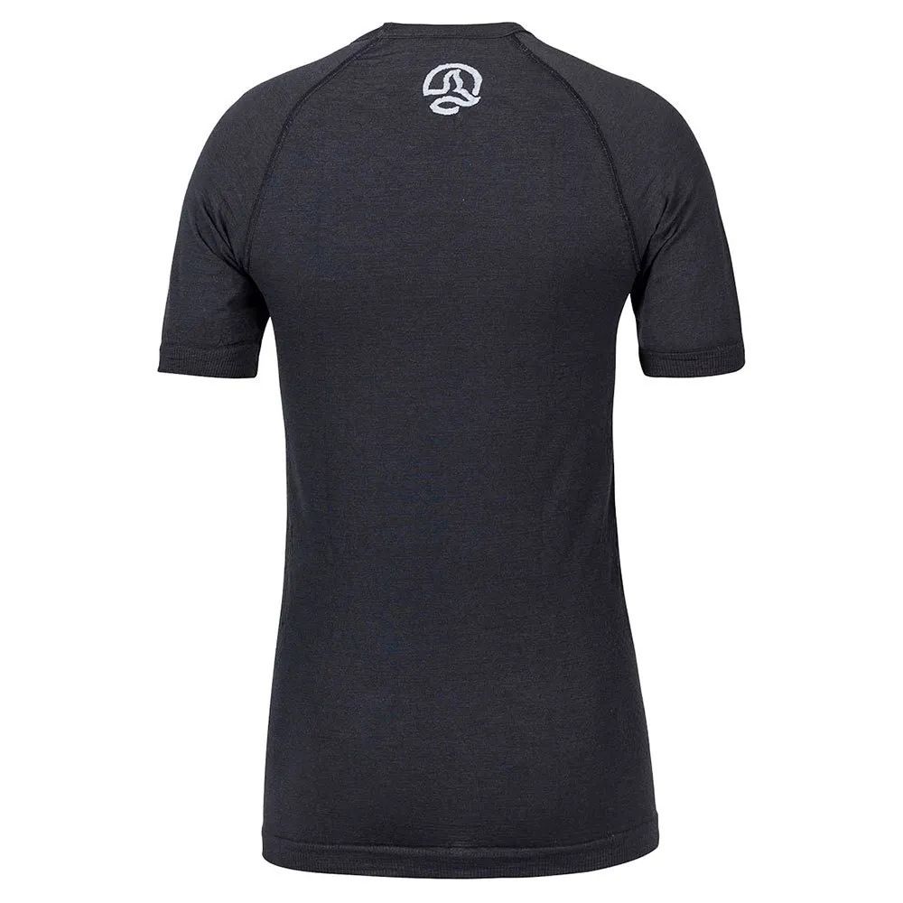 Warm, breathable and seamless first layer short-sleeved T-shirt made from a mixture of Tencel and wool in contact with the skin and elastane covered with Seacycle recycled polyamide on the outside.