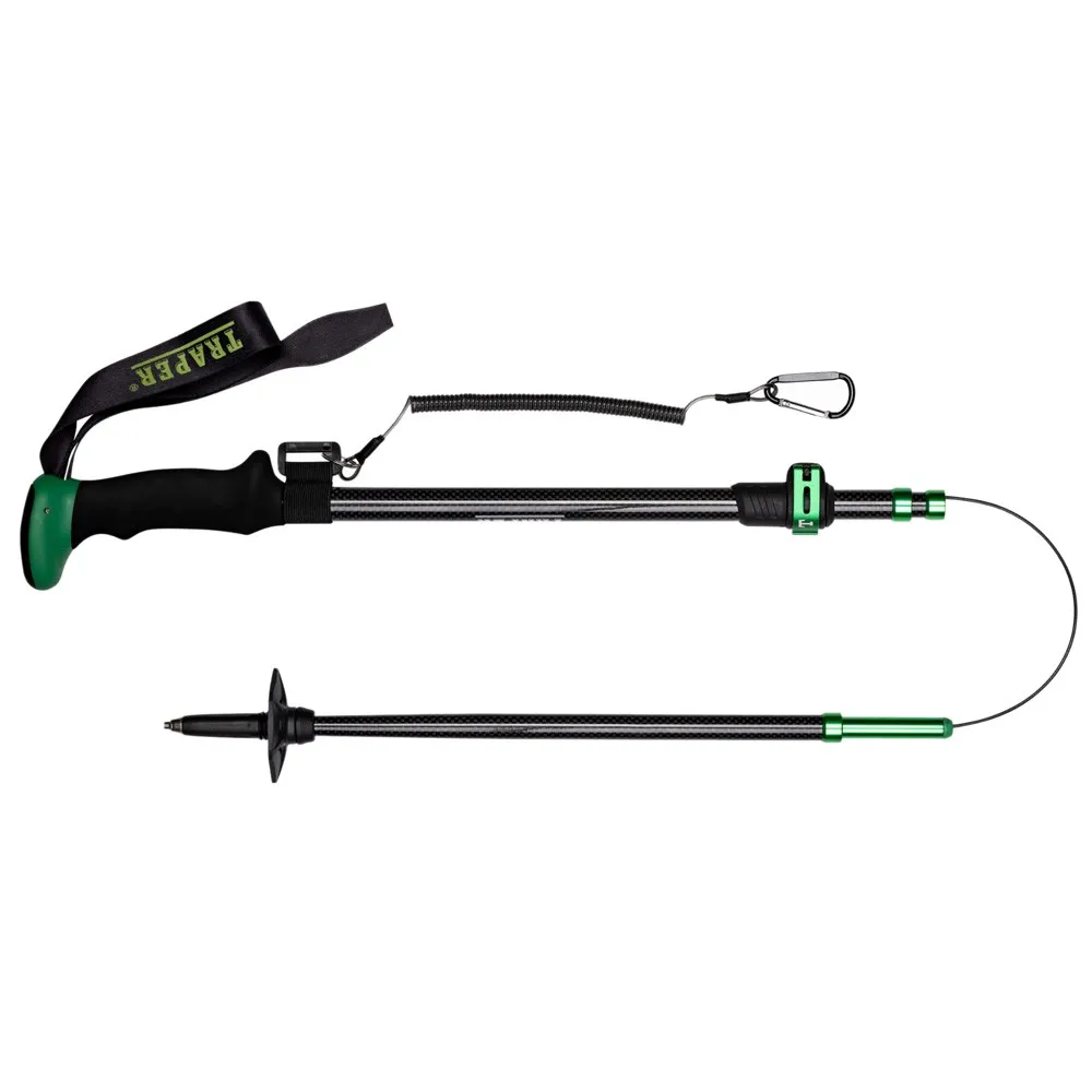 River Carbon wading stick weighs only 236 grams. Extremely lightweight thanks to the high modulus carbon blank. Thick carbon walls make this stick very strong and reliable. . It enough to spread apart the sections of the stick connected with the line to expand it. Spread until the spring blockade works. To adjust of the stick´s length pull the main section with handle. There is the centimetre/inch scale on the third section. Very robust EVA foam handle with the wrist loop for firm and safe grip. The bottom end is finished in sintered carbide. Comes complete with rubber hood, strong plastic plate and neoprene holdall. Detachable line with snap prevents from loosing the stick.