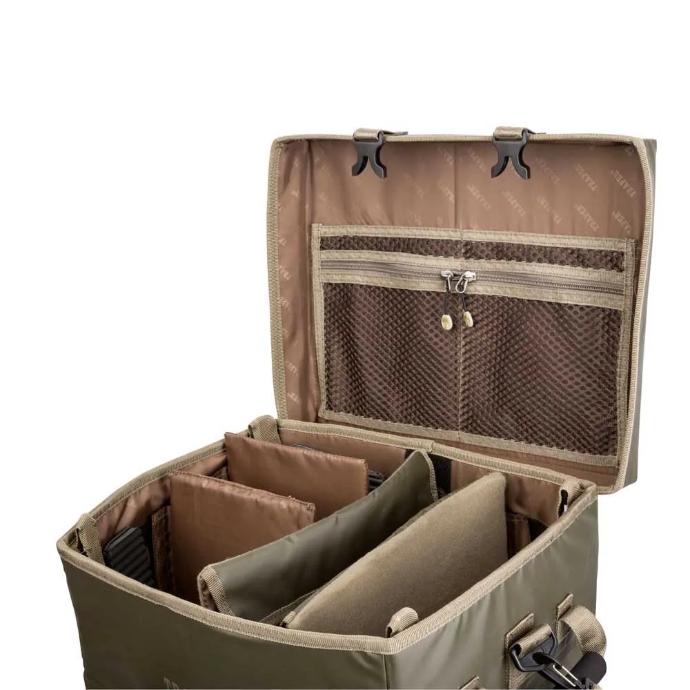 100% waterproof bag, manufactured of PVC. Stiffened walls for great stability. The bag has got compartment walls with pockets for accessories and fly patches. The walls are Velcro mounted so you can adjust them freely. This bag will be great for boat fishing, even during the heaviest rains the interior will remain dry. The bag includes the transportation belt and extremely comfortable, soft carrying handles.