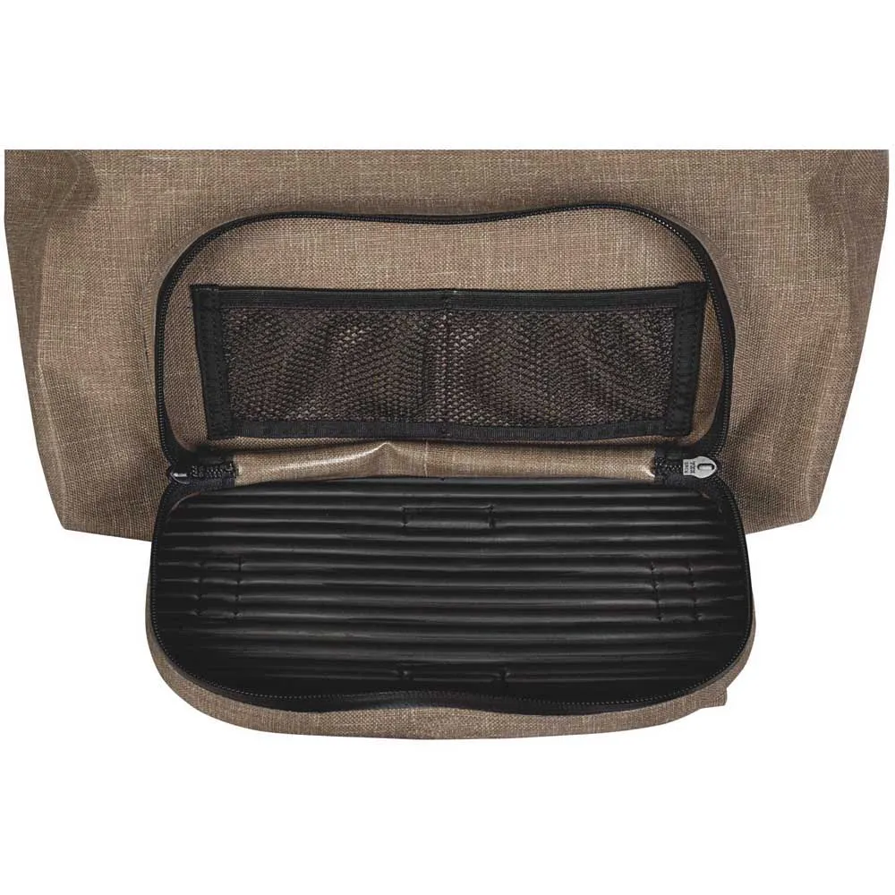 The important advantage of this interesting bag is adjustment possibility by rolling. There are two pockets with compartments for accessories in the external part. There is a pocket with foam for flies and two mini chambers at front. There are special net mounts for bottles or cans at both sides of the belt.