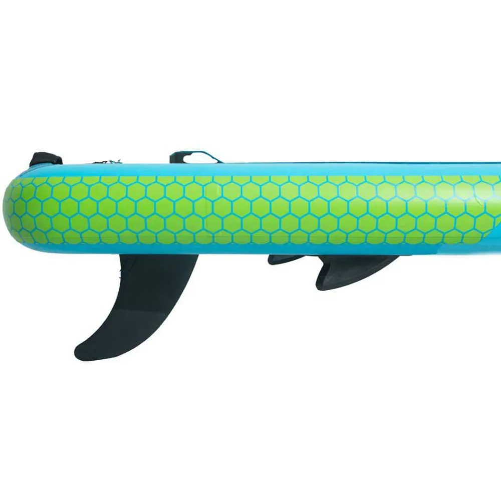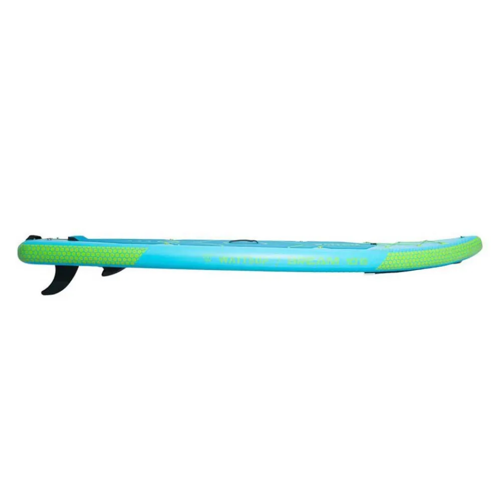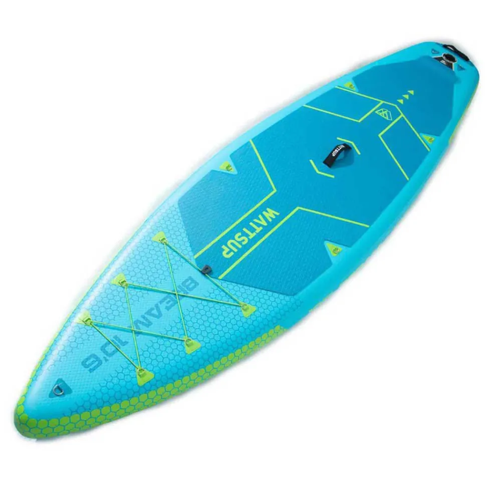 The WATTSUP Bream Combo 10'6'' inflatable paddle surf set in Blue/Lime is the perfect choice for those looking for a versatile and convenient paddle board option. This set includes everything you need to hit the water and start paddling, including the inflatable paddle board, a paddle, a pump, a leash, and a backpack for easy transportation.