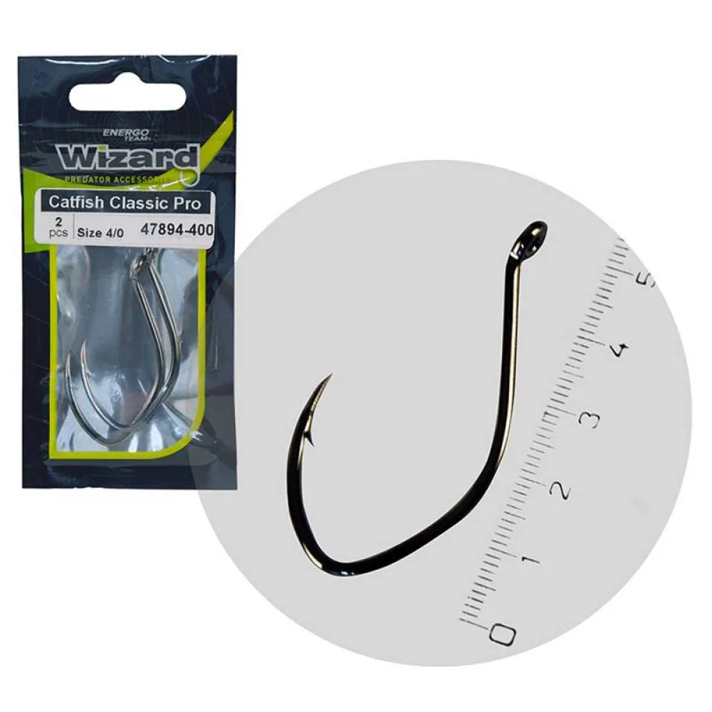 Wizard Catfish Classic PRO Hook There can be no compromises when it comes to catfish fishing, especially in the selection of hooks. In our Wizard predatory fishing segment, the latest series of catfish hooks, the Catfish Classic PRO, has been developed along this line. The Classic PRO version has a longer shank, making it an excellent choice not only for soft lures, but also for live bait methods. Being an eyed hook, it´s easy to tie with thick braided line sas well. The design of the Classic PRO ensures versatility, perfect for both lake or river scenarios, whether for buoy, float, or bottom fishing for catfish.