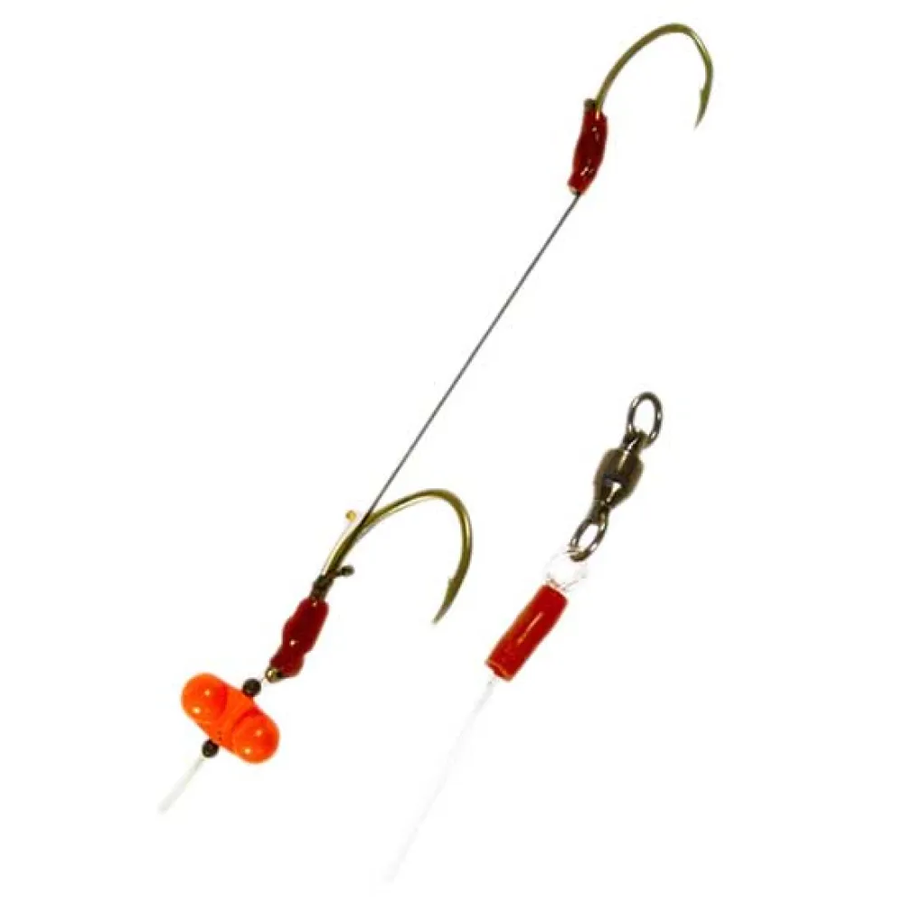 A double-hook monofil adjustable rig. Its structure: swivel - monofil leader line rattle hook braided leader line - hook + knot protectors. This rig has been specifically designed for breakaway and CatMagnet techniques. It is also ideal for longer buoys (such as the 90 cm ones available in our range). We recommend it for baiting with a single live fish.