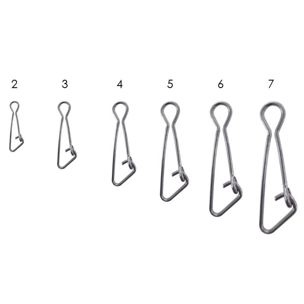 Versatilidad universal: Estos clips son los todoterreno definitivos para su caja de aparejos. Su diseño universal los hace perfectamente compatibles con una amplia gama de señuelos, desde jigs y spinners ligeros hasta swimbaits y plugs de alta resistencia. Son la elección preferida para cualquier pescador que busque simplificar su configuración de aparejo terminal sin comprometer el rendimiento Diseñado para una Integración Perfecta