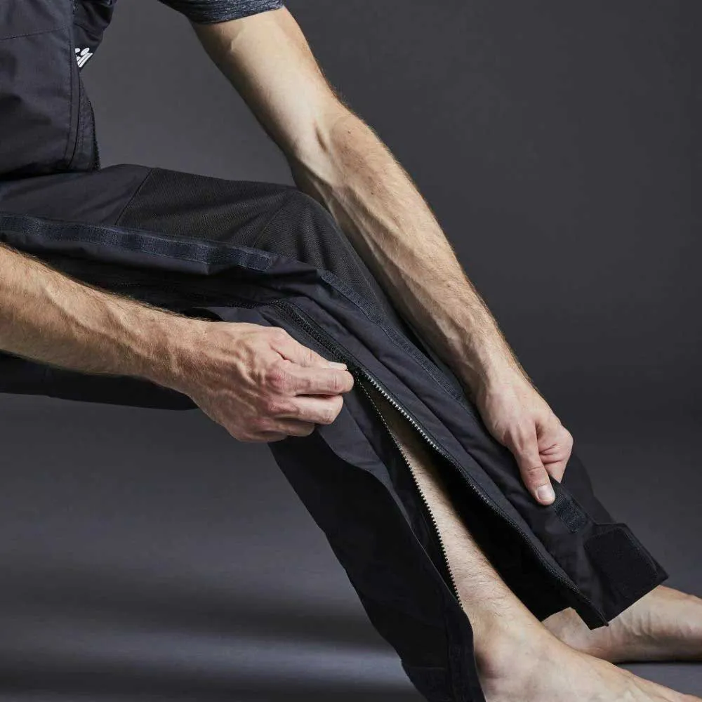 La parte superior de las piernas con cremallera a la altura del muslo está protegida por una doble protección contra tormentas.