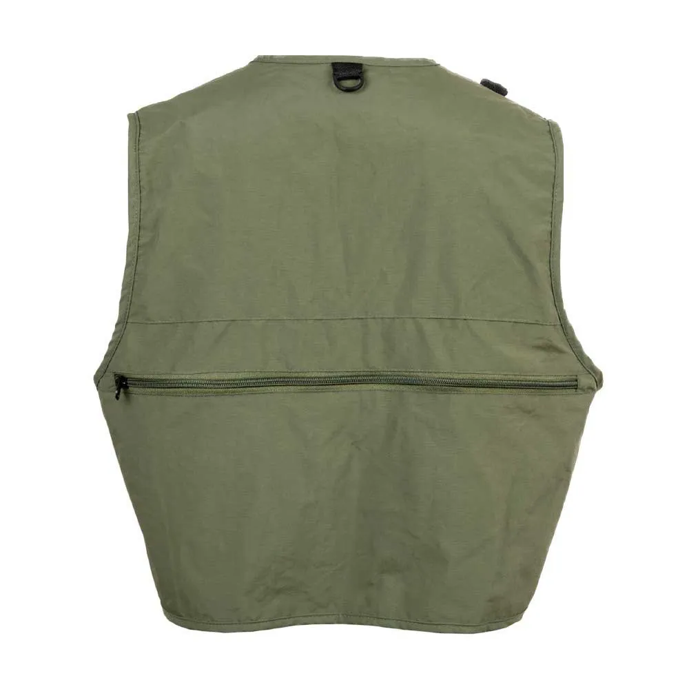 Chaleco técnico de pesca para múltiples usos. Tejido ligero y resistente de secado rápido. Forro interior de malla para favorecer la ventilación. 2 bolsillos en el pecho (uno con cierre de cremallera). Anilla portaobjetos en el hombro derecho y anilla central trasera para colgar accesorios. 2 grandes bolsillos portacajas con cierre de cremallera y 3 bolsillos adicionales superpuestos, con solapas de cierre de velcro para guardar diferentes accesorios. Mochila trasera de gran capacidad. 1 bolsillo interior.