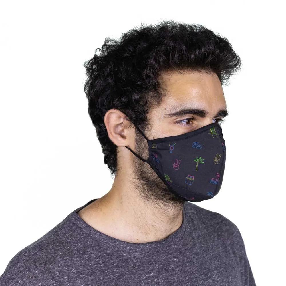 Mascarilla confeccionada con tejidos transpirables: 100% Poliéster en el Exterior (mejor repelente de humedad) y Forro 100% Algodón (proporciona una agradable sensación a la piel). Lavable y reutilizable.