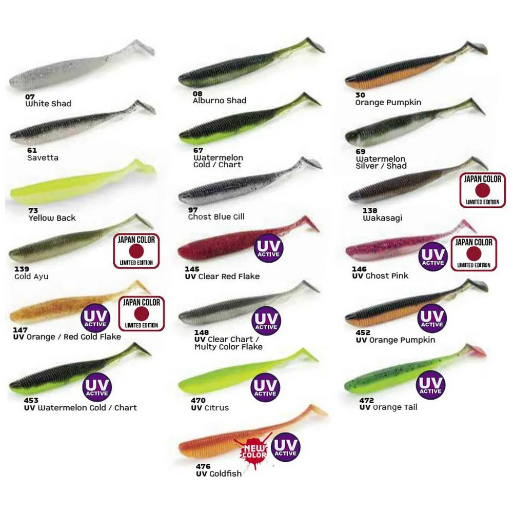 Soft bait inspirado en el cuerpo del Ra Shad 3.8?? manteniendo la mezcla a alta densidad y aroma de extracto de craw y shad. En la extremidad del cuerpo, su cola en hoz emite vibraciones extremadamente atrayentes y particulares sobre todo en aguas muy claras y presionadas. Vinilo polivalente, se presta a la perfección con montajes dropshot, splitshot, texas y carolina rig, incluso también como trailer de spinnerbait; la carta de colores contiene colores adecuados para el bass y también para otros depredadores como perca y lubina.