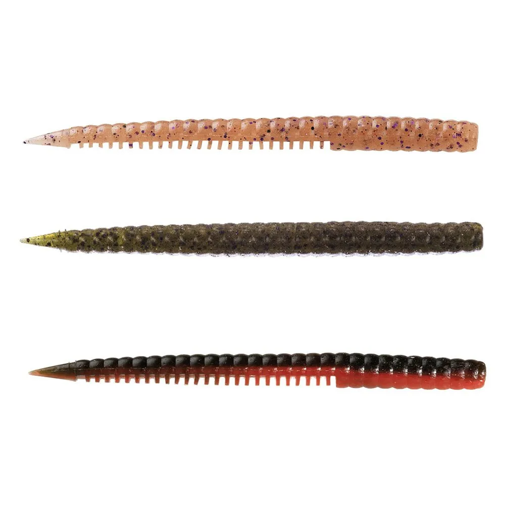 Stick bait único, renovado y realizado con nuevas mezclas exclusivas a “densidad variable” para dar consistencia y gran capacidad de lance y penetración en zonas ricas en vegetación. Perfecto equilibrio y movimiento muy natural en el agua. Insuperable cebo para la pesca en el mar, donde es necesario utilizar un vinilo en fuertes corrientes. Ha dado los mejores resultados en aguas profundas, montado con pesados jig heads. Los “Flaps” del cuerpo realizan tres funciones importantes: hacen el movimiento más natural, recogen aire durante la caída liberándolo en el agua y emiten vibraciones similares a las de los peces pasto.
