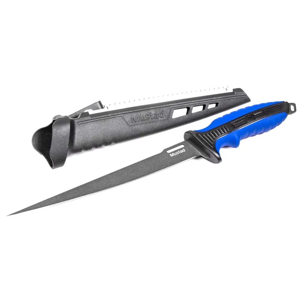 El nuevo cuchillo de filetear de 9 pulgadas de Mustad cuenta con una hoja de acero inoxidable alemán con un revestimiento de PTFE antiadherente duradero para un corte perfecto. El mango antideslizante del cuchillo está diseñado ergonómicamente para una comodidad superior. La funda incluida está equipada con un descamador de pescado, lo que garantiza que siempre estés preparado.