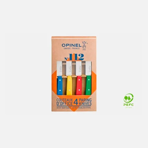 Juego de 4 cuchillos mondadores N°112 en colores vivos: azul, amarillo, rojo.