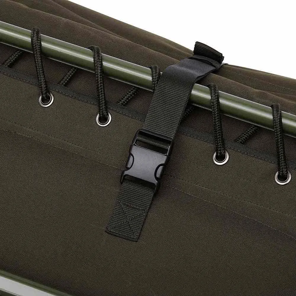 Todas las sillas de cama de esta gama cuentan con un sistema de doble bisagra y plegado plano que permite almacenar y guardar su saco de dormir, mesa de bivouac y otros objetos planos dentro de ella mientras está en tránsito.